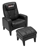 Settle in and relax in our collegiate series Leather Casual Chair. Built with an all steel frame that uses No Sag Spring Suspension for superior comfort and support. Luxurious, ergonomically designed seating surfaces with soft leather, sculpted from High Resiliency Cold Molded Foam along with a unique lumbar support system and adjustable headrest make the Collegiate Casual Chair ideal for watching your favorite team on TV. It is an elegant addition to any area in your home and is an excellent investment in comfort and quality. Additional features include double tongue mortise & tenon construction, and center slide lock mechanism that allows you lock the seat and back in any position with the touch of a button. Your favorite college team logo is on the headrest to enhance your game day experience. Black wood finish. Dimensions: Height - 42 in, Width - 35 in, Depth - 33 in. Weight (chair): 61 lbs, Weight (ottoman): 21 lbs. Ottoman available in black leather. Made in North America.