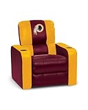 Washington Redskins leather recliner. This Star 1 recliner chair is constructed of high quality top grain leather (leatherette sides and back for ease of maintenance) with an embroidered logo sewn into the back. To recline, simply reach your hand on the inside right arm of the chair and push the recline button. These DreamSeats are manufactured by Berkline, a nationally renowned furniture manufacturer since 1928. To assemble, slip the back on the base. Easily assemble the chair in about 10 minutes without using tools. Dreamseat has the Wallaway feature, which means You only need to position your chair 3 inches away from the wall for it to fully recline. Measurements: Overall Depth: 39 in, Overall Height: 41 in, Overall Width: 39 in, Seat Width: 25 in, Arm Width: 7.5 in, Overall length reclined: 60 in, Overall length fully reclined: 68 in. PLEASE NOTE SHIPS IN 4-5 WEEKS.