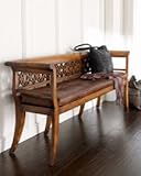 Settee is handcrafted of acacia wood with an English polish finish. Seat is covered in tufted leather. 69W x 15D x 32T with a 22T seat. Imported.